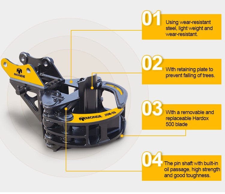 Gergaji pohon ekskavator berkinerja tinggi dirancang khusus untuk membantu berbagai pekerjaan kehutanan. Selain memotong batang kayu, alat ini sangat berguna untuk reklamasi lahan atau pegunungan, penebangan di perkebunan, produksi bahan bakar biomassa, hingga memangkas cabang-cabang pohon untuk menjaga kebersihan dan keselamatan di sepanjang jalan. Alat ini memberikan solusi efisien untuk kebutuhan perawatan hutan dan lingkungan sekitar.