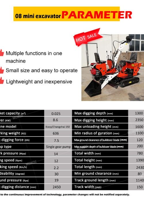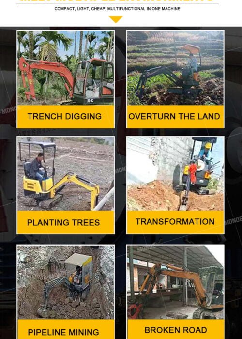 Mesin Penggali Mini Digger Kebun 0,8 ton, 1 ton, dan 1,5 ton sangat berguna di bidang pertanian dan konstruksi. Alat ini bisa digunakan untuk berbagai keperluan, seperti membuka lahan wasteland, menggali batu, membuat jalan di area berbukit, penanaman, perbaikan jalan, menggali saluran kabel, drainase, serta perusakan di dalam maupun luar ruangan. Dengan kemampuannya yang serbaguna, mesin ini memudahkan banyak pekerjaan berat dengan lebih efisien.
