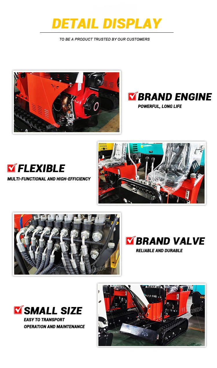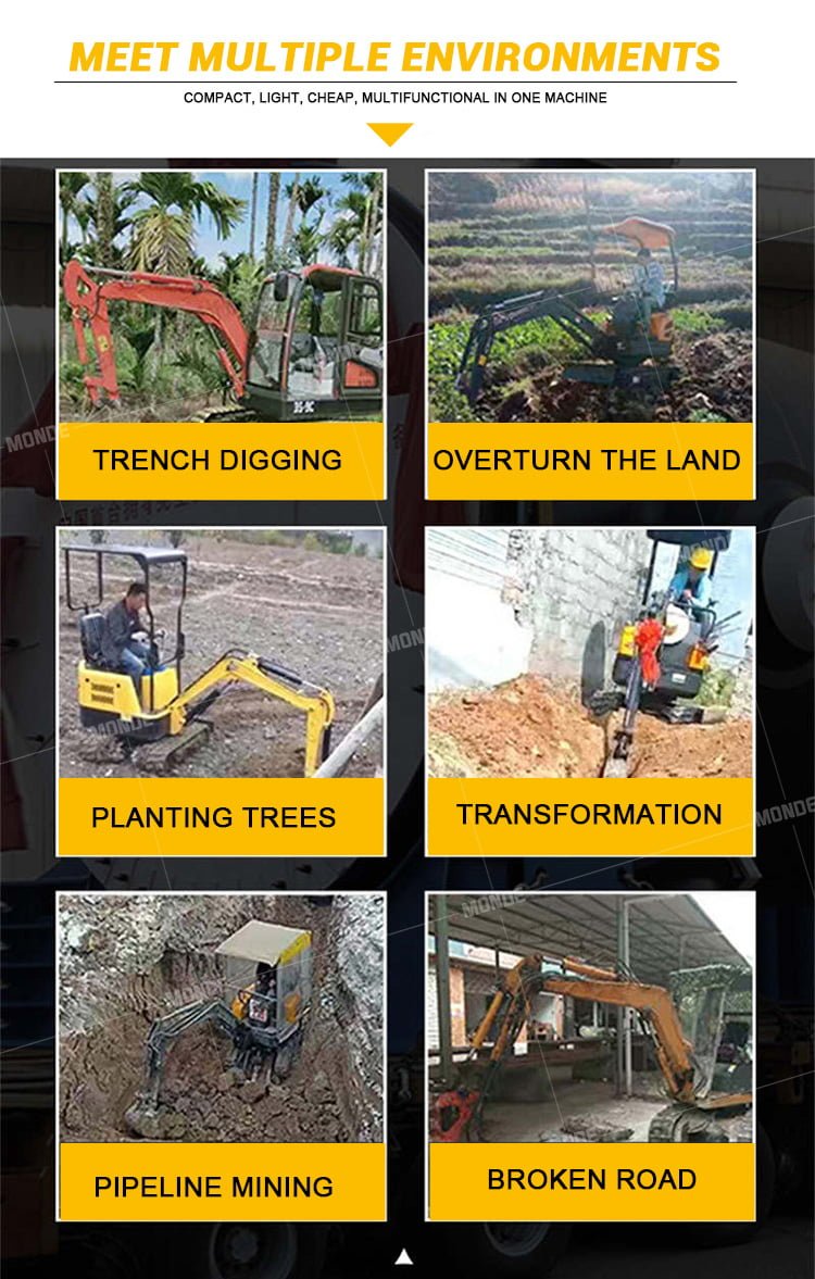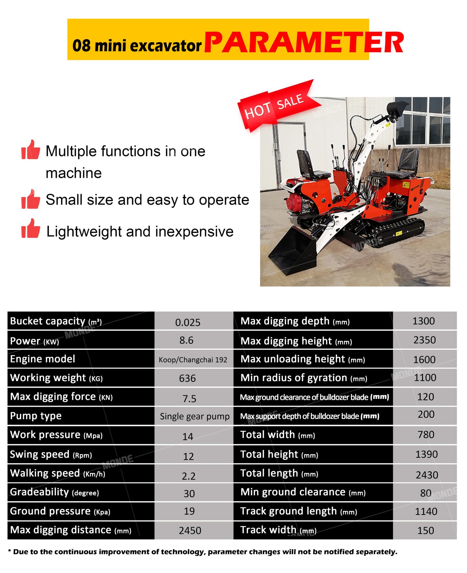Mini excavator 08 dilengkapi dengan trek karet atau baja yang andal dan mudah digunakan. Alat ini memiliki berbagai fungsi, seperti menggali, mencengkeram, mengebor, meratakan tanah, membersihkan parit, dan memecah batu. Dengan kemampuan ini, excavator ini sangat cocok untuk berbagai proyek konstruksi, termasuk pasokan air, listrik, gas, jaringan telekomunikasi, serta pekerjaan di lahan pertanian dan taman.