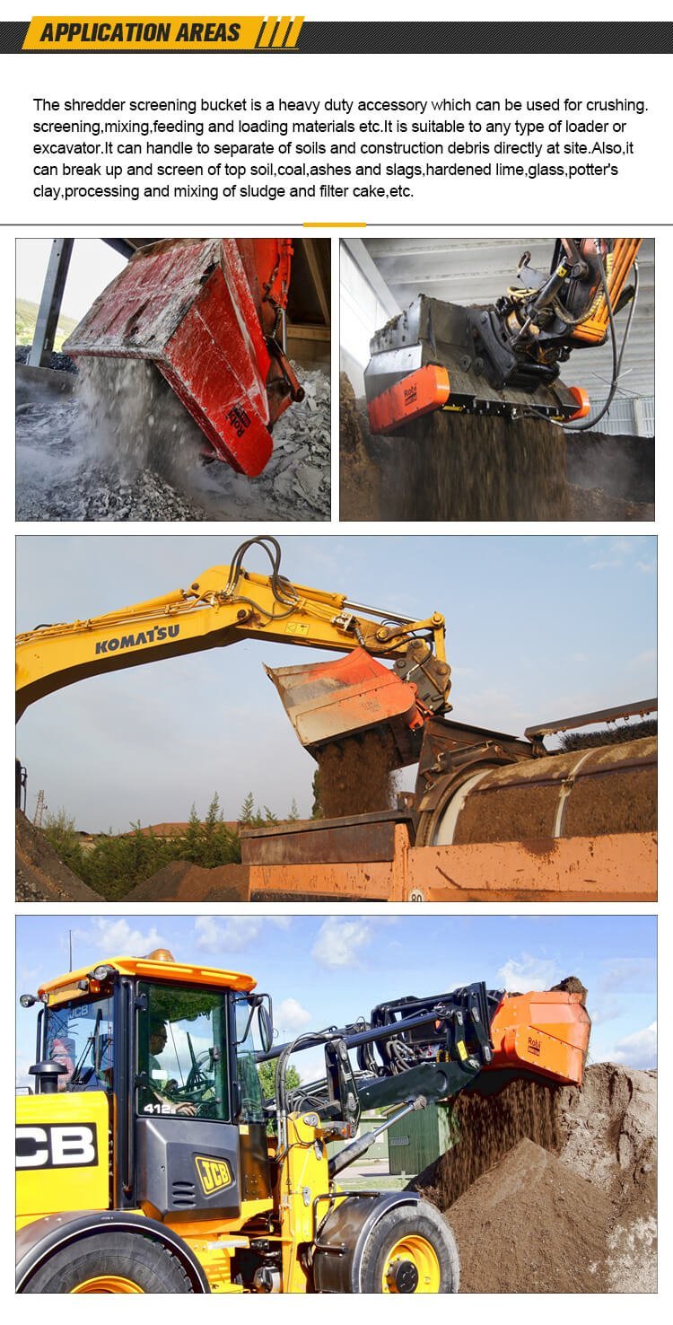 shredder Screening Bucket adalah alat serbaguna yang dirancang untuk berbagai pekerjaan berat, seperti menghancurkan, menyaring, mencampur, memberi makan, dan memuat material. Alat ini cocok dipasang pada loader atau excavator jenis apa pun, membuatnya sangat fleksibel di lokasi proyek. Selain dapat memisahkan tanah dan puing-puing konstruksi secara langsung di lokasi, alat ini juga bisa memecah dan menyaring tanah lapisan atas, batu bara, abu, terak, serta material lain seperti kaca, tanah liat, lumpur, dan kue filter. Dengan begitu, pekerjaan menjadi lebih efisien dan cepat.